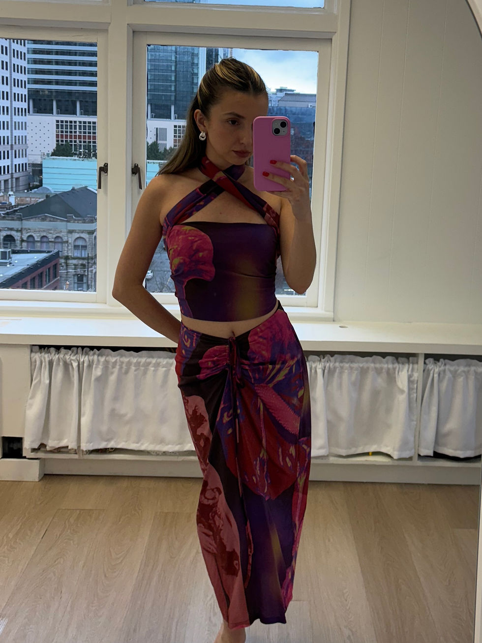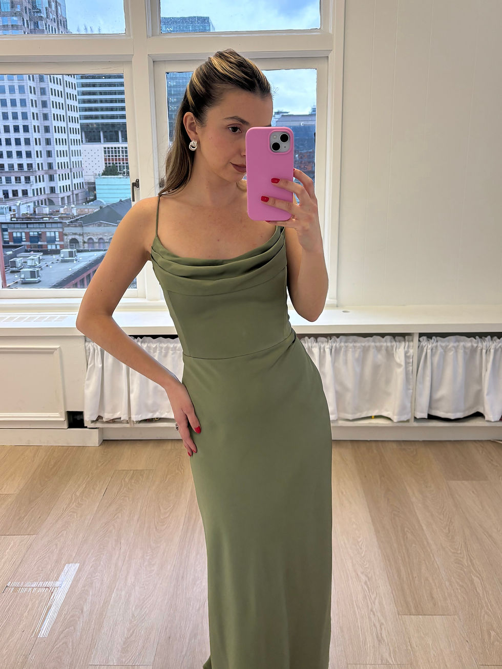 One shoulder sequin mini with a velvet tie belt, which allows you to draw in the waist and adjust the silhouette’s length. The dress has an invisible side zip closure.